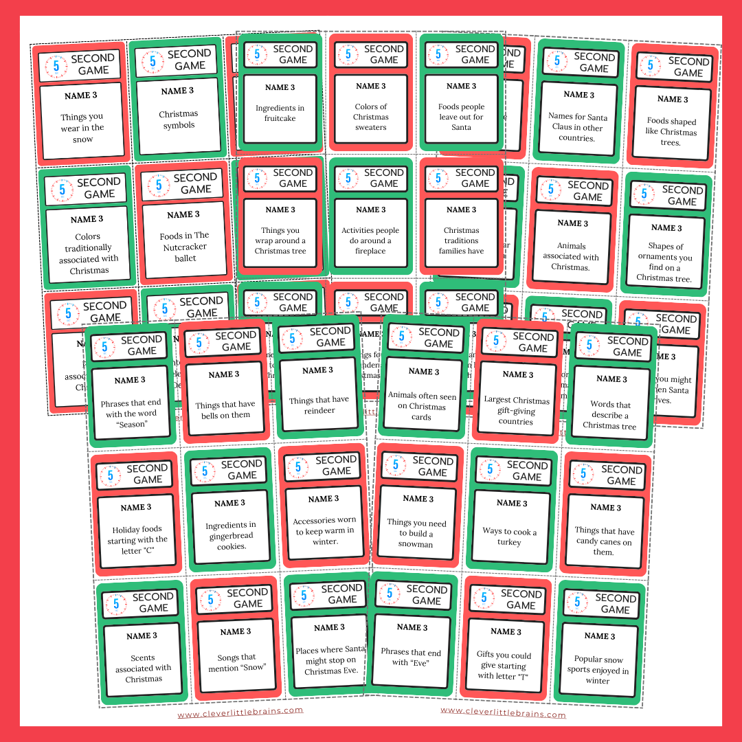 Get ready for fast-paced holiday hilarity with our 5-Second Game Cards! Designed to ignite creativity and quick thinking, these cards challenge players to name three things from festive categories within just five seconds.