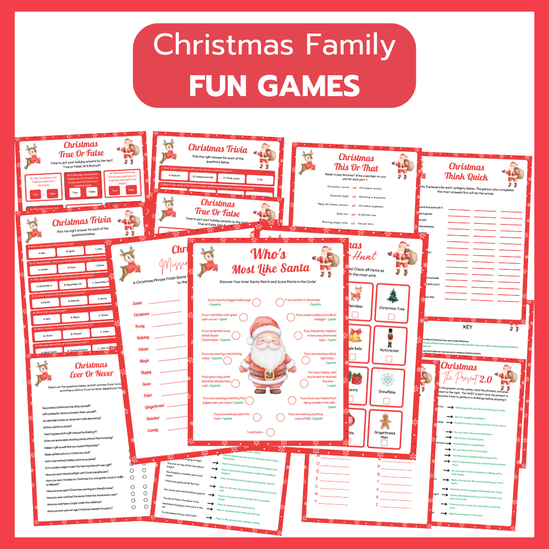 Get ready for laughs with Mad Libs, Ever or Never, and Missing Phrases, plus heartwarming fun with Who's Most Like Santa and a Christmas Scavenger Hunt.